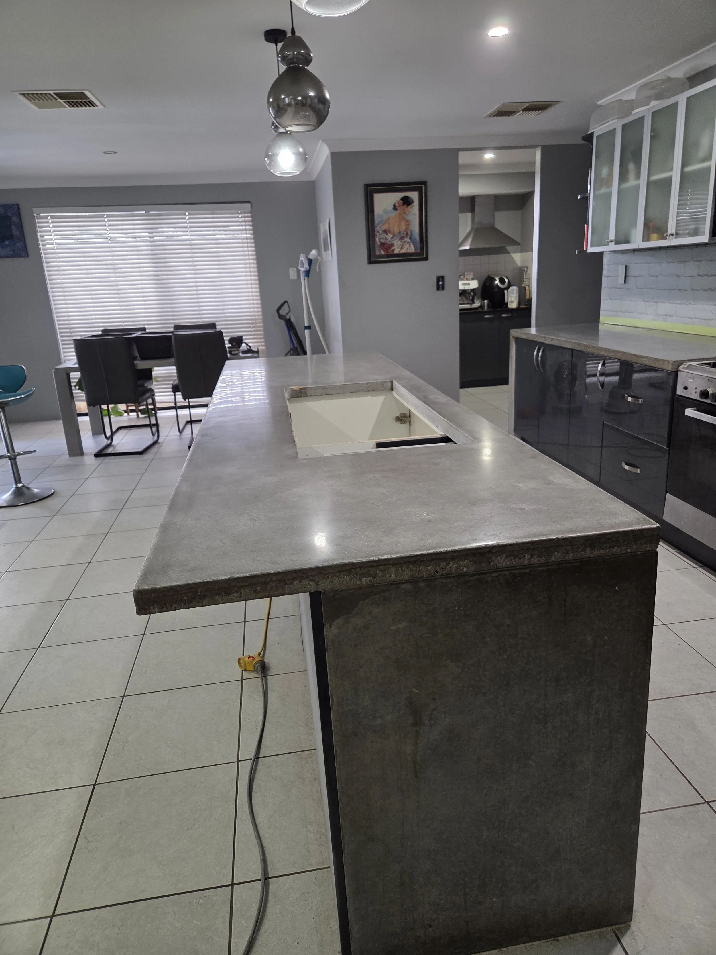 Empty kitchen island with a cutout in the center and an electrical cord hanging from the side, with a modern kitchen and dining area in the background.
