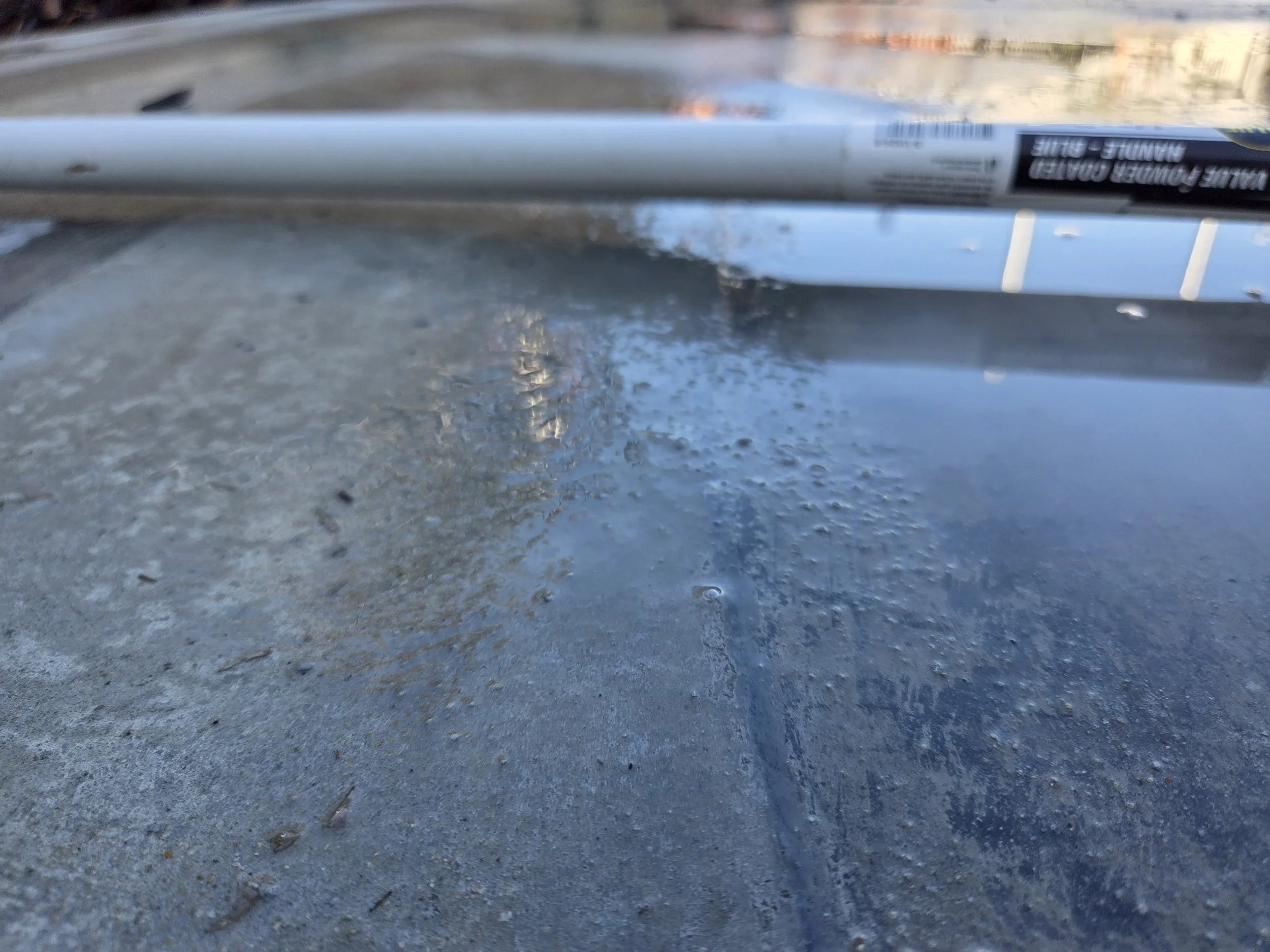 Close-up of a concrete surface with water droplets, pointing to a metal pole or rod lying horizontally.